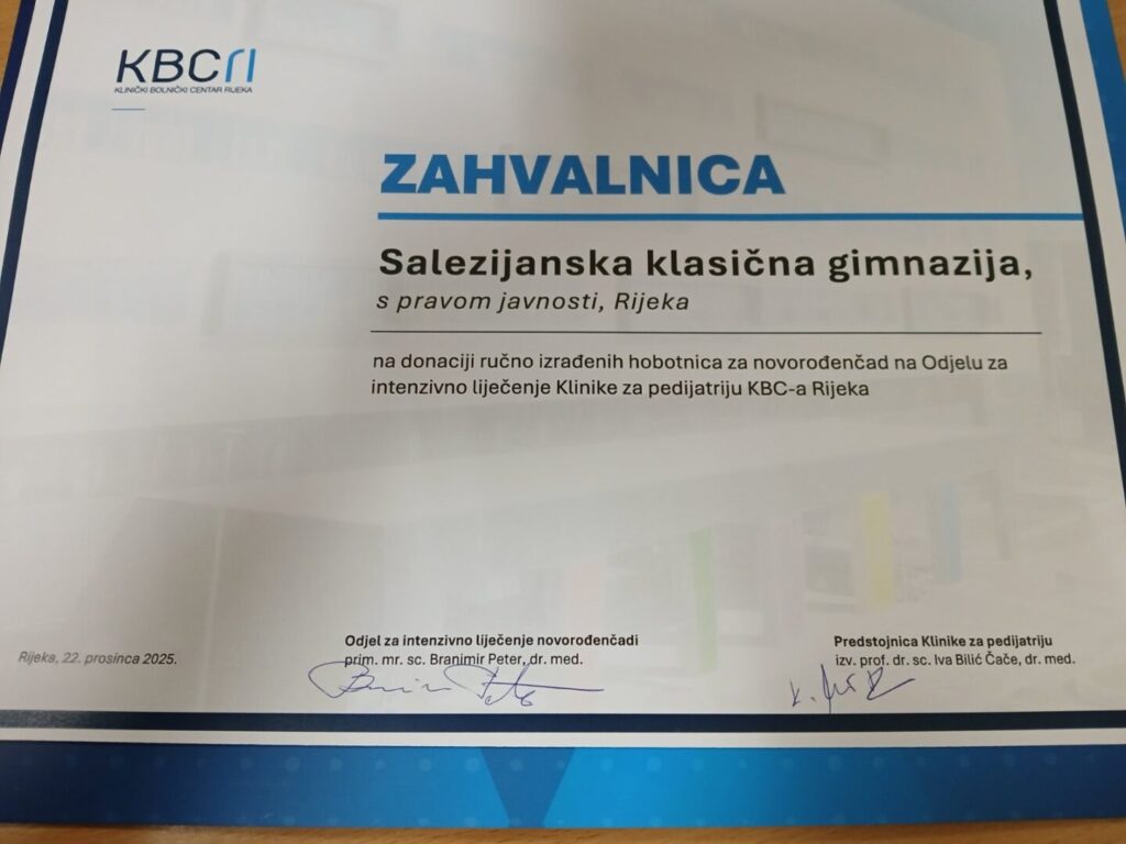 Na Odjelu za intenzivno liječenje novorođenčadi Klinike za pedijatriju KBC-a Rijeka, 22. prosinca 2025. održano je svečano uručenje 22 ručno izrađene hobotnice, poznate kao “hobice”, koje su izradili naši učenici.